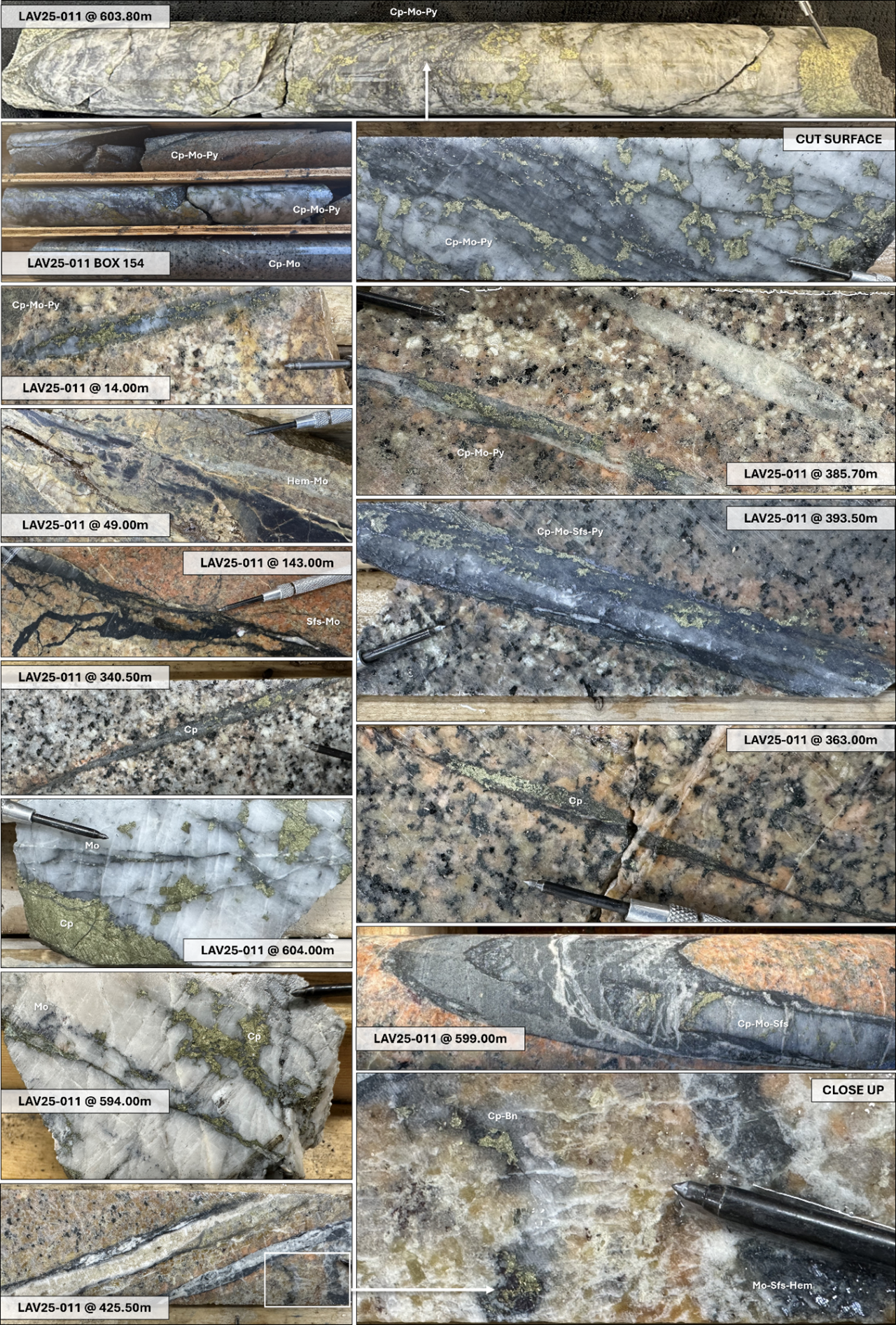 Figure 1: Photographs of HQ and NQ-sized drill core from drill hole LAV25-011. All depths listed are drilled depths. Bn – bornite; Cp – chalcopyrite; Mo – molybdenite; Sfs – sulphosalt (Ag-bearing); Hem – specular hematite; Py – pyrite; Qtz – quartz.