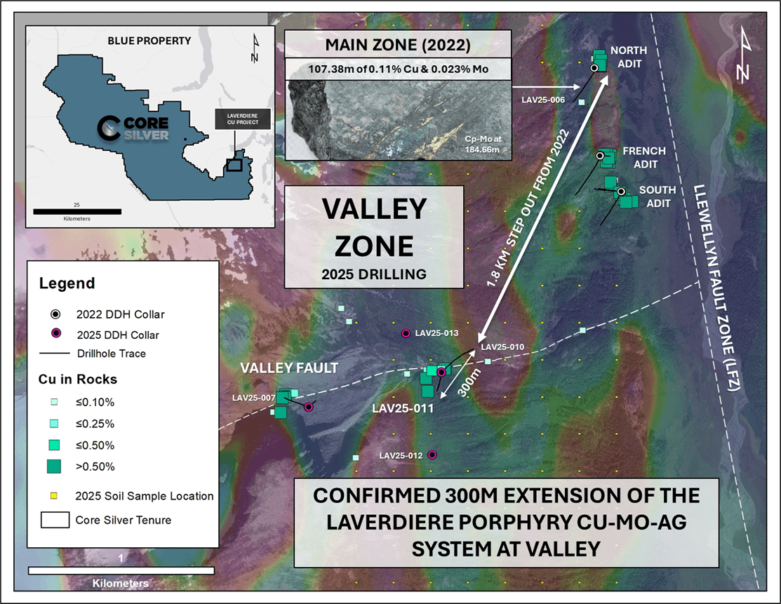Vancouver, British Columbia – December 9, 2025 – Core Silver Corp. (“Core Silver” or the “Company”) (CSE:CC) (FSE:8ZR) (OTCQB:CCOOF) is pleased to present visuals and geological highlights from drill hole LAV25-011, the second of four deep exploratory diamond drill holes completed during the 2025 season at the Laverdiere Copper Project (the “Project” or “Laverdiere”), located on the eastern Blue Property in the Atlin Mining District, northwestern British Columbia.