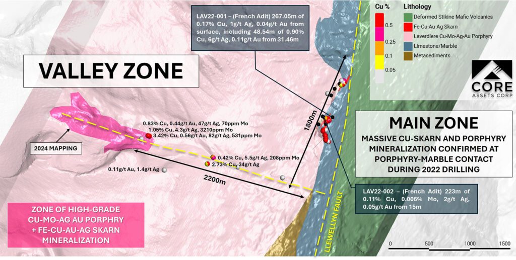 At the Laverdiere Copper Project, an extensive Cretaceous granodiorite intrusion hosts widespread Cu-Mo-Ag-Au porphyry mineralization over a 1.8km by 2.2km trend. The intrusion is associated with zones of very high-grade Fe-Cu-Au-Ag massive sulphide skarn that are exposed at surface along the western flank of the prolific Llewellyn Fault Zone (LFZ) at the porphyry-marble contact. In 2024, high-grade porphyry mineralization at the newly defined Valley Zone was structurally mapped and sampled, and updates to the Laverdiere Copper Project 3-D geologic model were completed.
